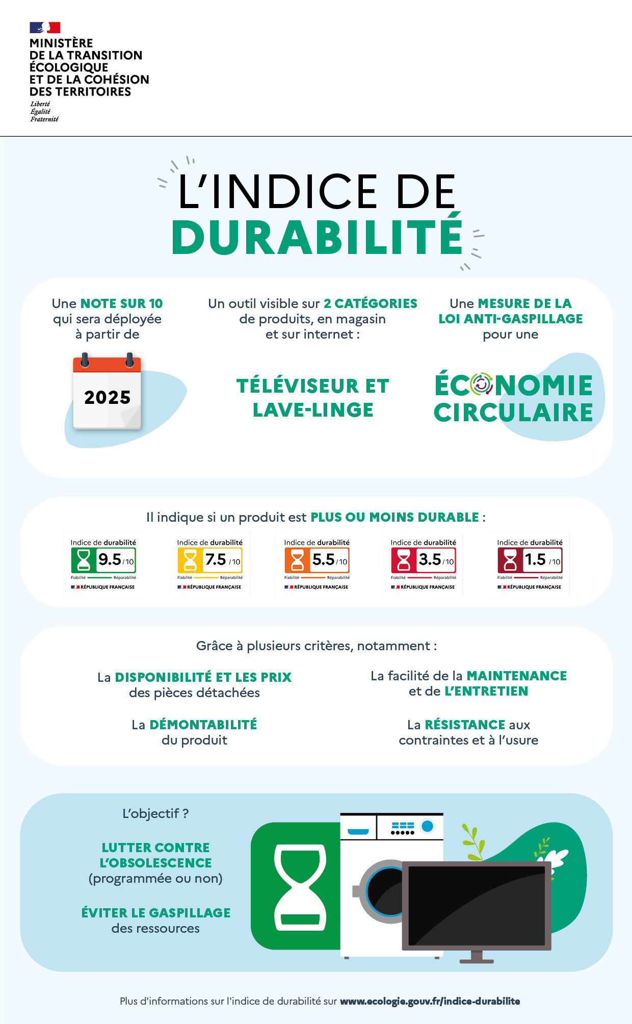L'indice de durabilité a été initié en 2024 mais il a commencé à être déployé à partir de janvier 2025 pour les TV. Il est étendu aux lave-linges depuis avril 2025. Il est communiqué sous forme d'une note, associée à un code couleur, allant de 0 à 10 (pouvant comporter une décimale) et du rouge au vert, permettant de se faire une idée sur la capacité des appareils à pouvoir être utilisés sur une période prolongée. Remplaçant l'indice de réparabilité, l'indice de durabilité prend en considération à la fois la réparabilité et la fiabilité (le cas échéant la possibilité d'amélioration logicielle / matérielle) des appareils. Chacun des deux aspects est évalué sur une échelle de 0 à 10 afin de déterminer la note globale sur 10. En comparaison à l'indice de réparabilité, l'indice de durabilité peut davantage contribuer à limiter le gaspillage et la pollution : bien qu'un appareil soit réparable, s'il tombe régulièrement en panne il y a une probabilité plus importante pour que l'utilisateur décide de le remplacer de façon précoce. En évaluant également la fiabilité, l'indice de durabilité permet, au moment de comparer avant de fixer son choix, de se faire une idée sur la potentielle différence de durée durant laquelle un appareil pourrait éventuellement être conservé plus longtemps qu'un autre.