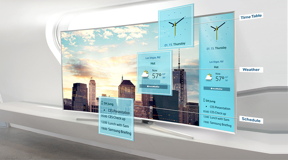 Equipées du nouveau système d'exploitation Tizen, les TV SUHD de Samsung embarquent une interface d'utilisation intuitive et fluide afin de simplifier la navigation parmi les menus et l'utilisation de multiples contenus : programmes TV, enregistrements PVR, applications internet, vidéo stockées dans un ordinateur, etc.